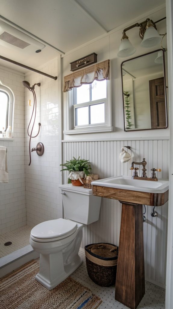 A cozy cottage-style RV bathroom features charming elements like beadboard walls, a pedestal sink, and vintage accessories. The soft color palette and quaint details create a warm and inviting space.