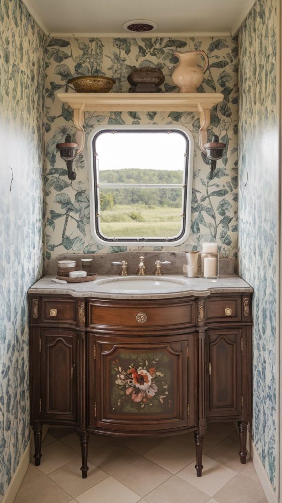A French country-style RV bathroom features charming elements and elegant touches. This design includes a vintage vanity, floral wallpaper, and antique accessories. The quaint and sophisticated look creates a cozy space.