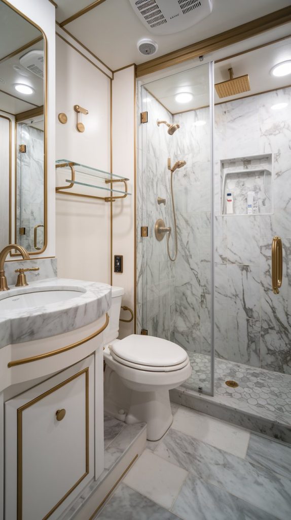 Gold accents can add a touch of glamour to any RV bathroom. This design features gold fixtures, a gold-framed mirror, and gold accessories. The luxurious and opulent elements create a high-end feel.