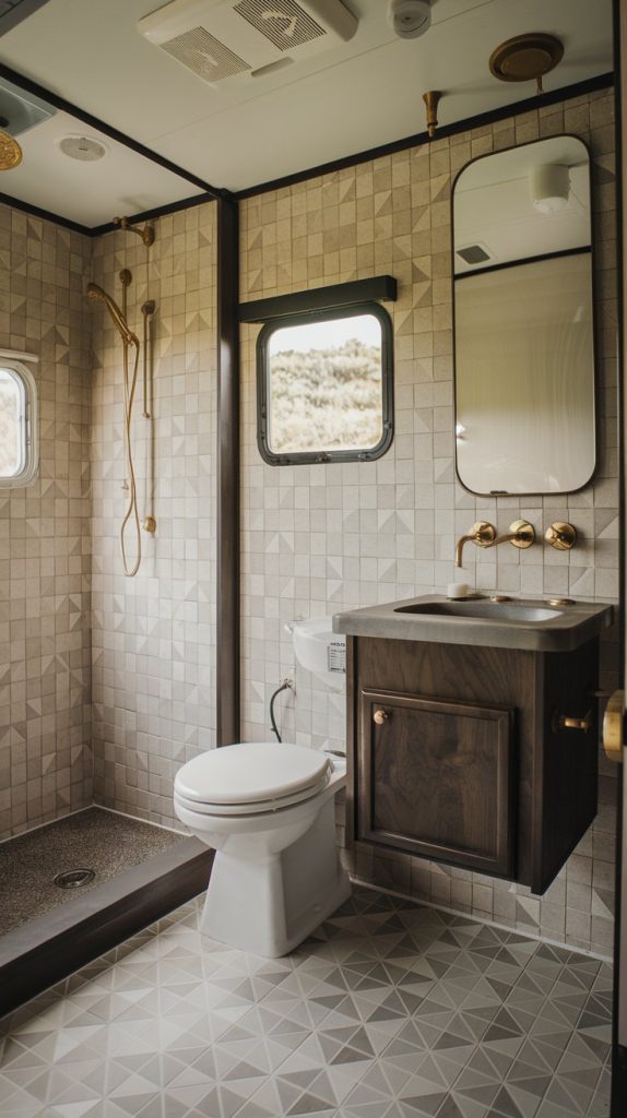 A mid-century modern RV bathroom features clean lines and retro elements. This design includes a floating vanity, geometric tiles, and brass fixtures. The stylish and functional look creates a timeless space.