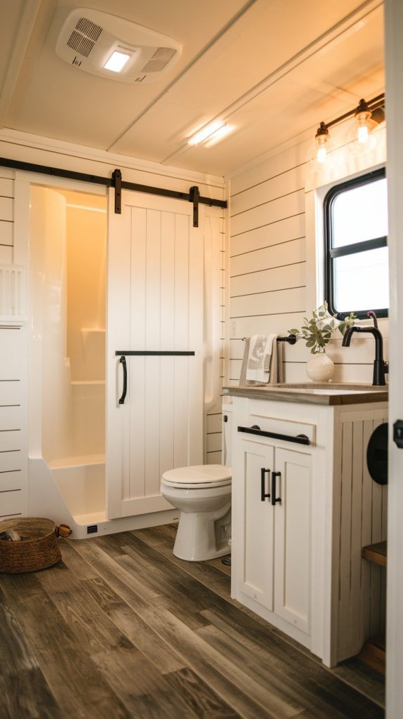 This RV bathroom combines the charm of a farmhouse with modern amenities. The shiplap walls, black fixtures, and a sliding barn door create a stylish and functional space. The mix of textures and materials adds depth and interest.
