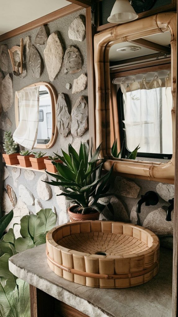 Bringing elements of nature into your RV bathroom can create a spa-like environment. This design features a bamboo sink, stone countertops, and a pebble-tiled shower floor. The greenery adds a fresh and vibrant touch.