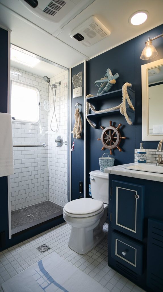 A nautical-themed RV bathroom features elements inspired by the sea. This design includes navy blue walls, white accents, and nautical decor. The coastal elements create a refreshing and adventurous atmosphere.