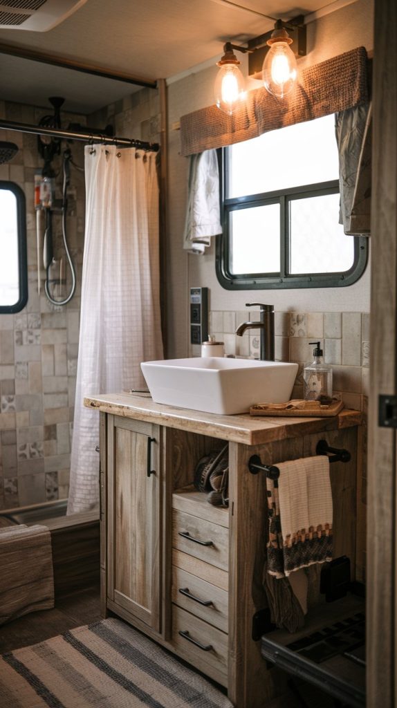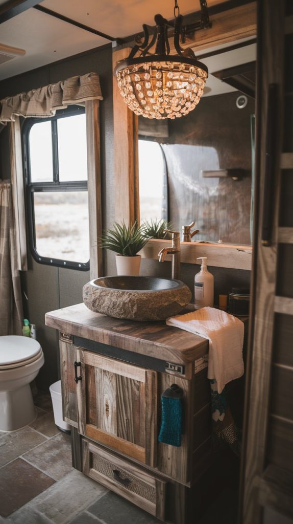 Combine rustic elements with elegant touches for a sophisticated RV bathroom. This design features a reclaimed wood vanity, stone sink, and crystal chandelier. The mix of materials creates a warm and upscale space.