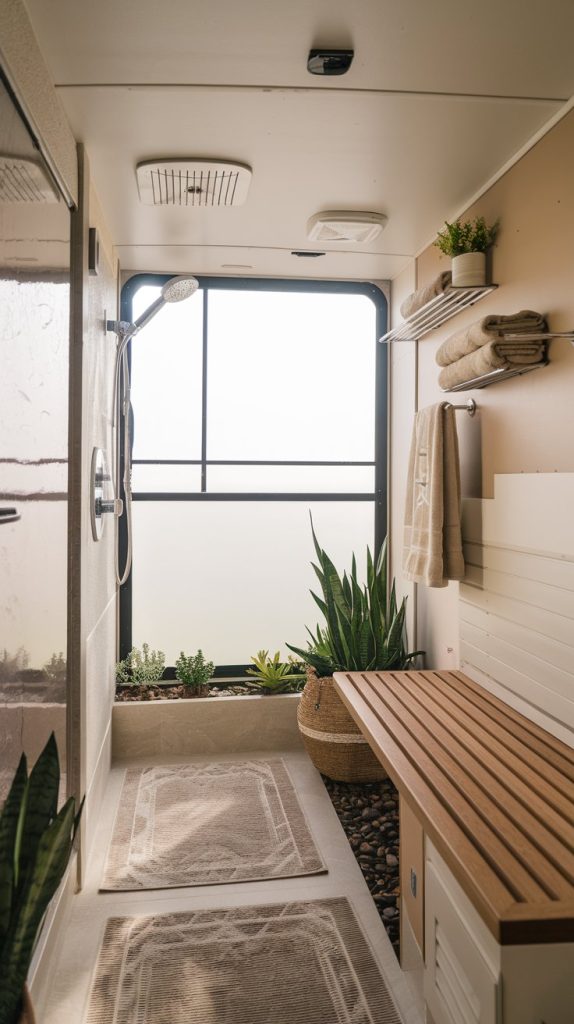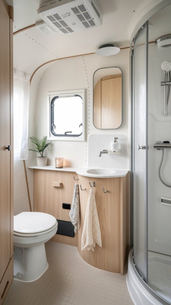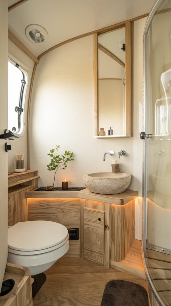 A Zen-inspired RV bathroom focuses on simplicity and tranquility. This design features natural wood elements, neutral colors, and minimal decor. The serene and uncluttered space promotes relaxation and mindfulness.
