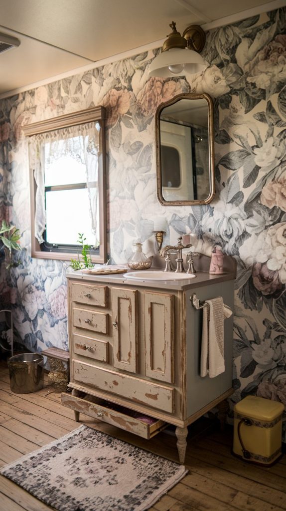 A shabby chic RV bathroom features vintage elements and soft colors. This design includes a distressed vanity, floral wallpaper, and antique accessories. The charming and quaint look creates a cozy space.