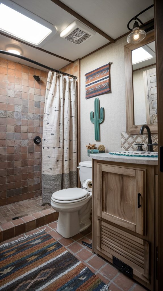 A Southwestern-inspired RV bathroom features earthy tones and rustic elements. This design includes terracotta tiles, a wooden vanity, and desert-inspired decor. The warm and inviting elements create a cozy space.