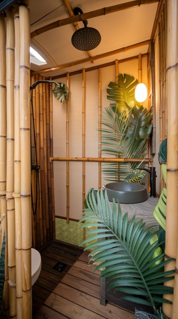 Bring a touch of the tropics to your RV bathroom with this design. Features include bamboo accents, tropical plants, and a rain showerhead. The lush and vibrant elements create a refreshing and exotic atmosphere.