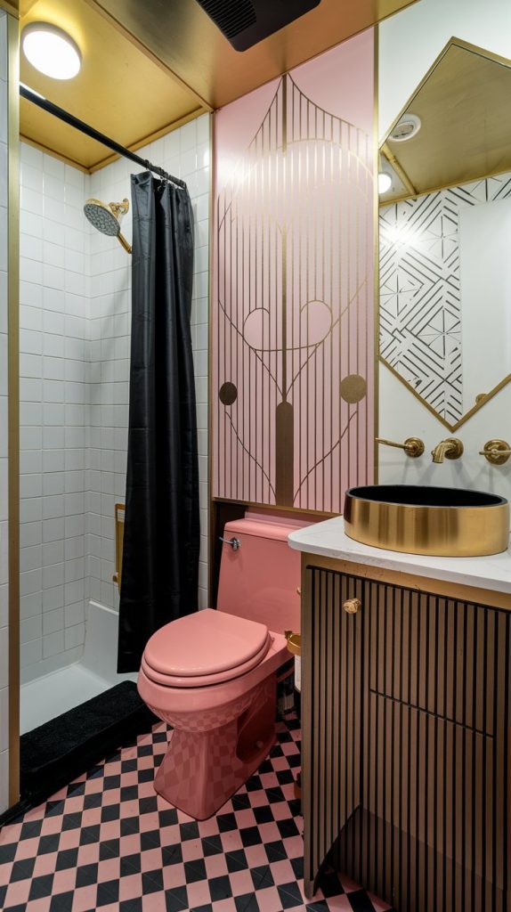 An Art Deco-inspired RV bathroom can add a touch of glamour and sophistication. This design features geometric patterns, gold accents, and bold colors. The luxurious and opulent look creates a statement space.