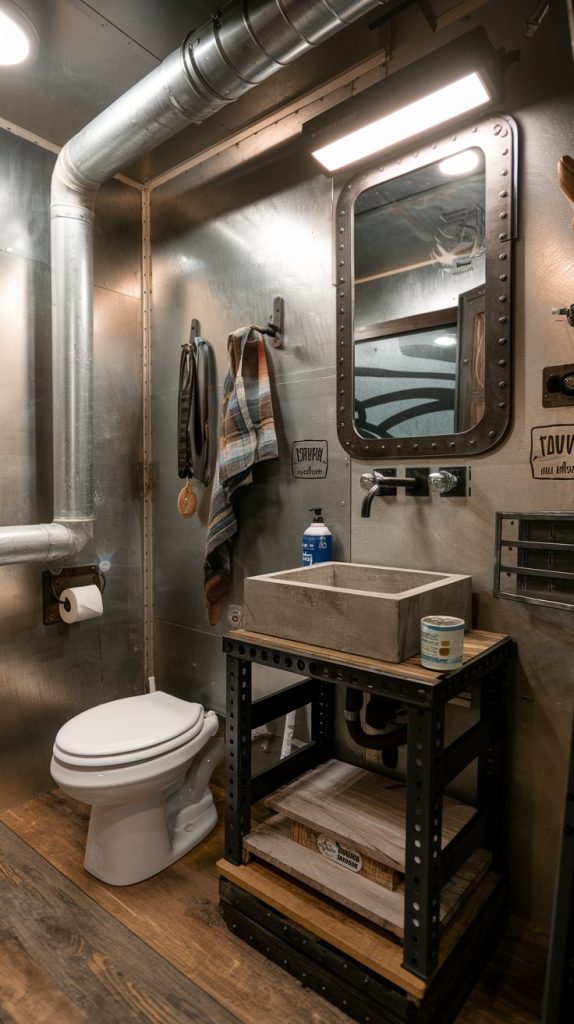 An industrial-style RV bathroom can add a touch of urban sophistication. This design features exposed pipes, a concrete sink, and metal accents. The raw and edgy materials create a stylish and modern look.