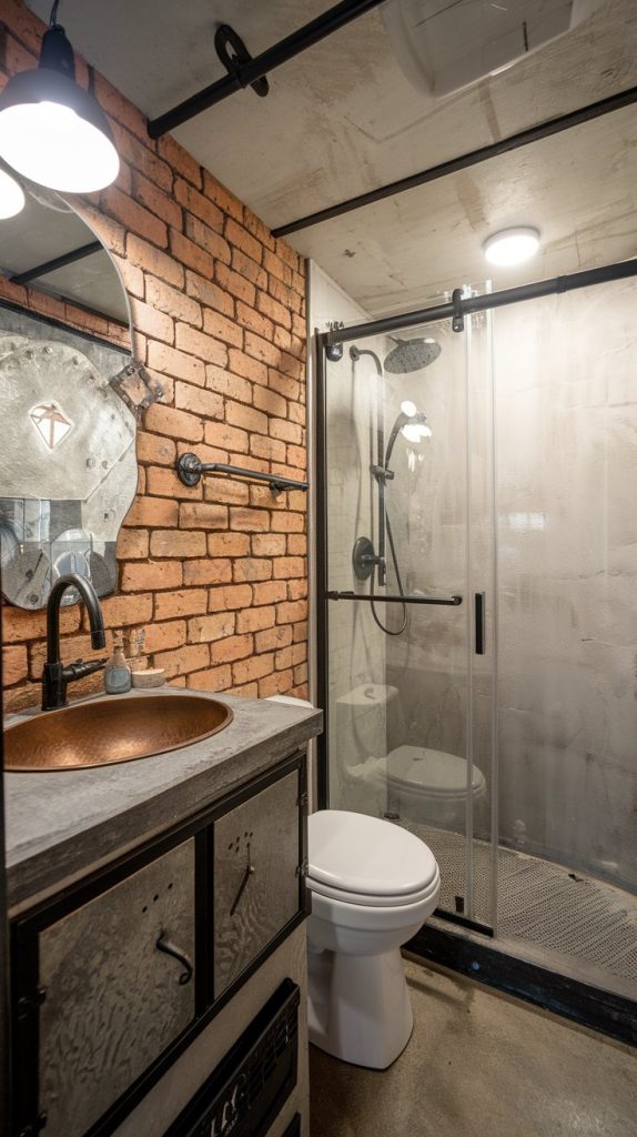 An urban loft-style RV bathroom features industrial elements and modern touches. This design includes exposed brick walls, metal fixtures, and concrete accents. The edgy and stylish look creates a contemporary space.