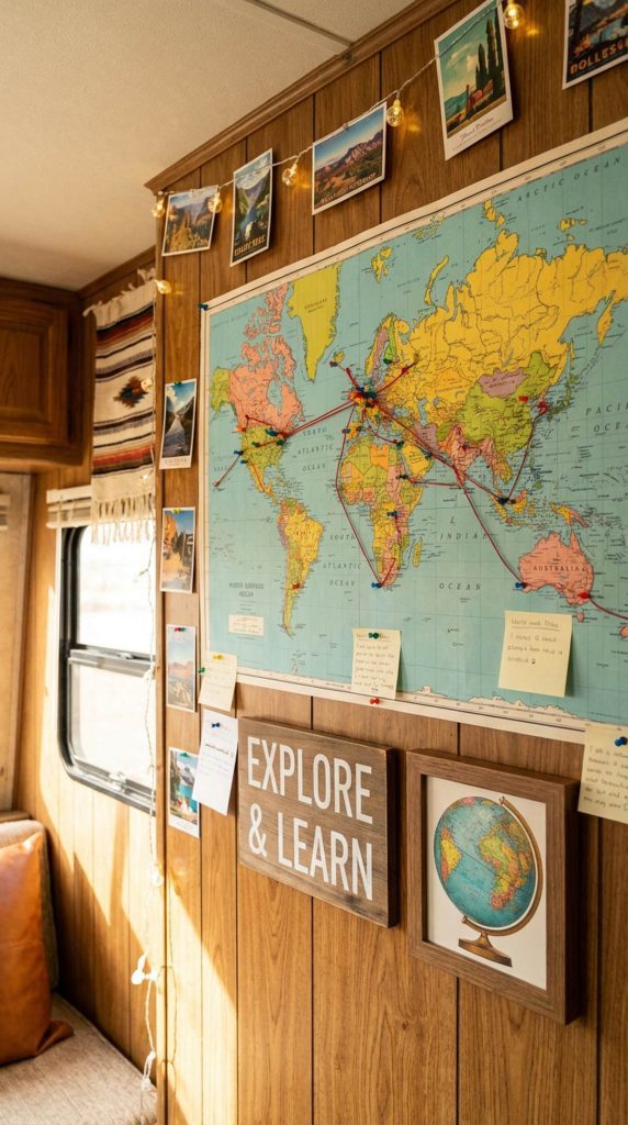 An interactive travel map turns your RV adventures into a visual learning experience. Hang a large map on the wall and use pushpins, stickers, or markers to track everywhere you’ve been and places you plan to visit. This interactive décor piece serves as both decoration and education, helping children develop geography skills, understand distances, and feel more engaged in the travel planning process.