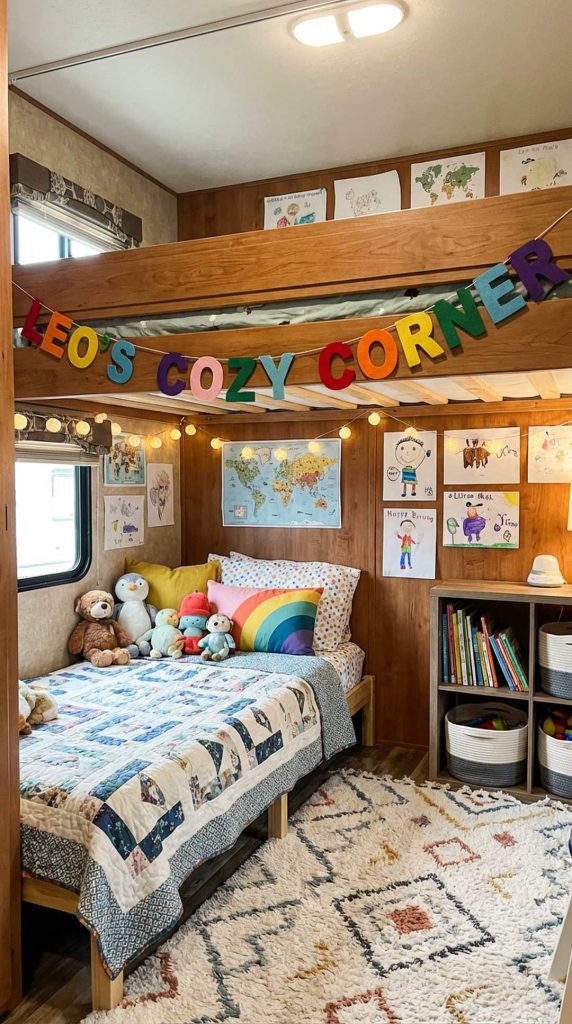 A personalized name banner above each child’s sleeping area makes them feel special and gives them ownership of their space. These decorative banners can be purchased ready-made or created as a fun DIY project using felt letters, fabric triangles, or wooden letters. The simple addition of a name banner transforms a generic sleeping area into “their” room, providing a sense of belonging and stability in the constantly changing RV lifestyle.