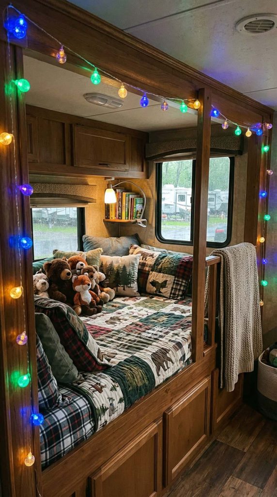 Create a dedicated reading nook that encourages quiet time and literacy. Transform an underutilized corner, window seat, or end of a bunk into a cozy retreat with soft pillows, a small bookshelf, and good lighting. This special space gives kids a place to decompress, especially important during long travel days or rainy weather when outdoor activities aren’t possible.
