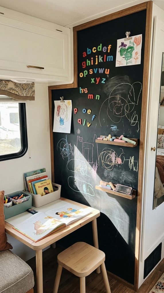 A magnetic chalkboard panel serves double duty as both a creative outlet and an educational tool. This functional décor piece can be mounted on any available wall space and provides endless entertainment for kids during travel days or downtime at the campsite. The magnetic surface means you can also use it to display artwork, photos, or important reminders with decorative magnets.