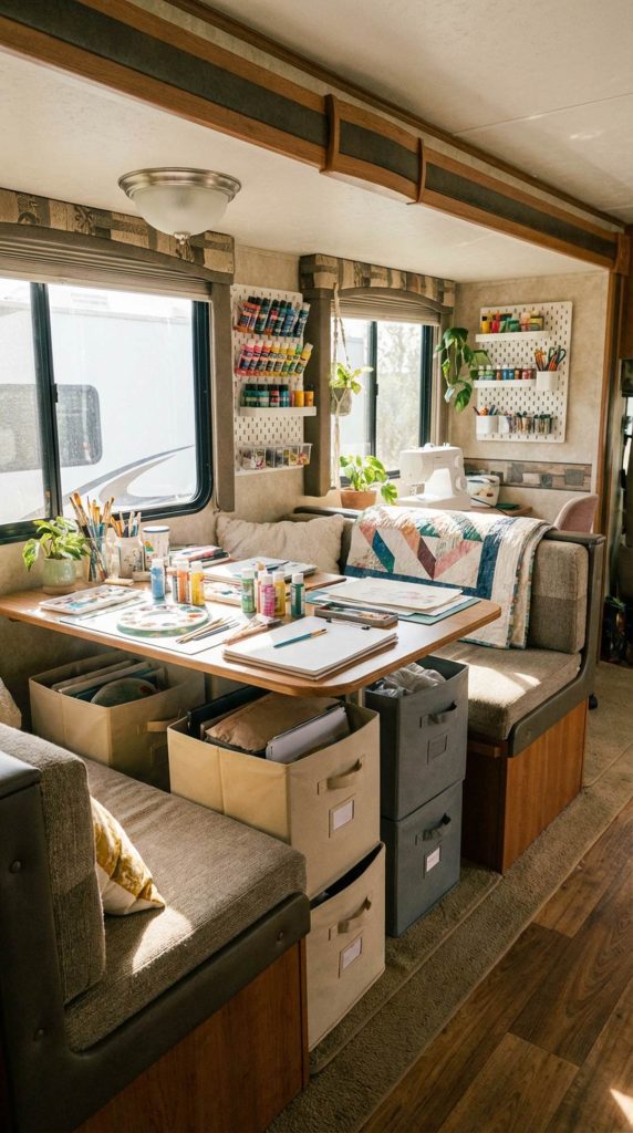 Maximize the often-underutilized space beneath dinette seating and bench areas with collapsible storage bins. These flexible containers can hold everything from toys and games to craft supplies and seasonal clothing. The collapsible design means they can be flattened when not in use, and the handles make it easy for kids to pull them out and put them away independently.