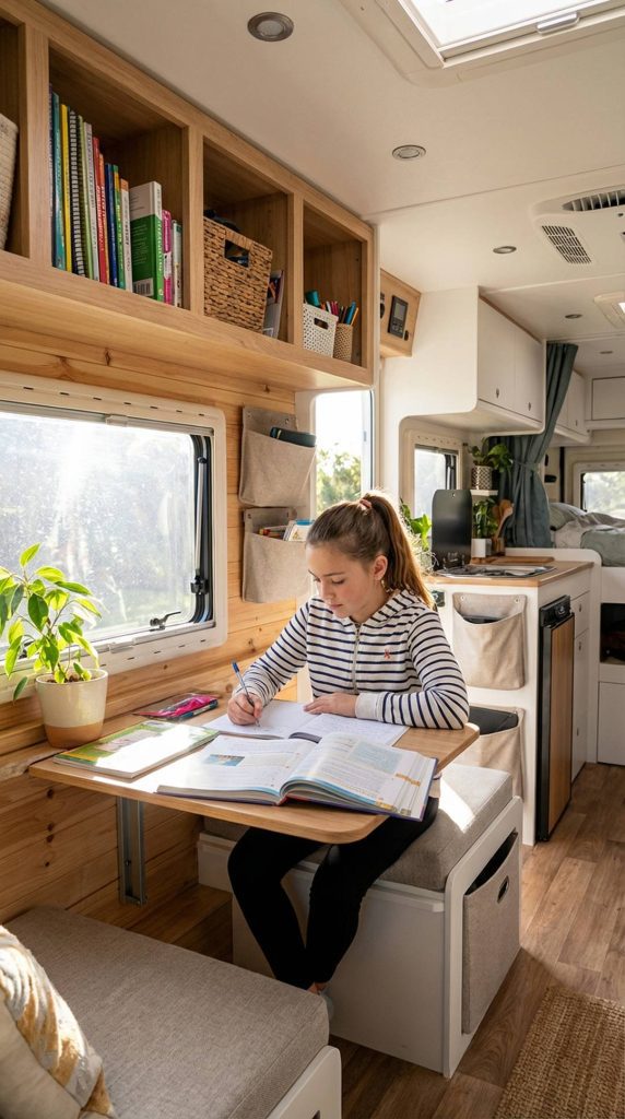 A fold-down desk attached to the wall provides a dedicated workspace for homework, arts and crafts, or quiet activities without permanently taking up valuable floor space. When not in use, the desk simply folds up against the wall, freeing the area for other purposes. This flexibility is essential in RV living where every square inch counts and spaces need to serve multiple functions.