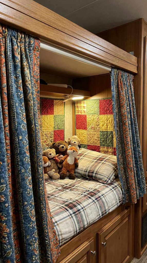 PRO TIP: Attach curtains with Velcro strips at the top and magnetic closures at the opening for easy use and secure positioning during travel. Let kids personalize their curtains with iron-on patches, fabric markers, or clips holding favorite photos, making their bunk truly feel like their own special place within the RV.