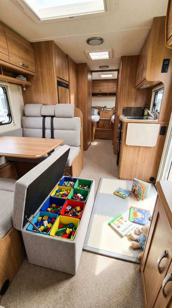 A washable area rug defines play spaces, adds warmth and comfort to hard RV floors, and can be easily cleaned when accidents happen. Choose rugs with playful patterns like roads for toy cars, animal designs, or educational elements like numbers and letters. The rug visually designates an area for play, helping kids understand boundaries within shared living spaces and protecting floors from wear and scratches.
