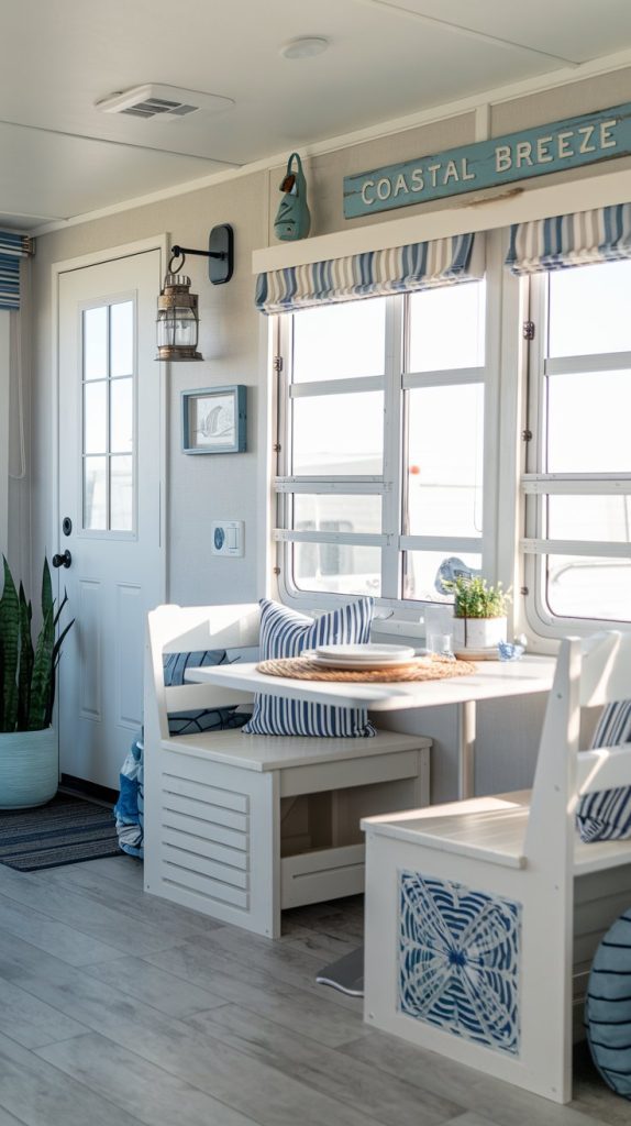 A coastal-inspired dining area with light colors, nautical decor, and a relaxed atmosphere. The space features a white table, blue accents, and plenty of natural light, creating a serene and beachy feel.