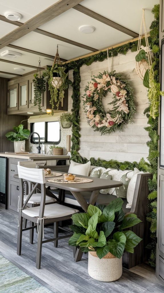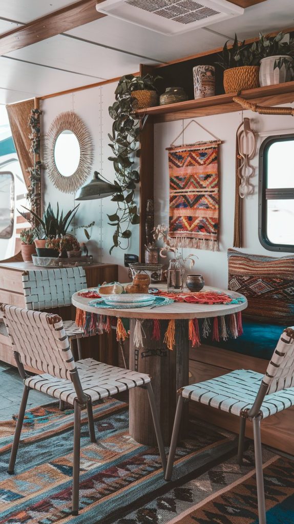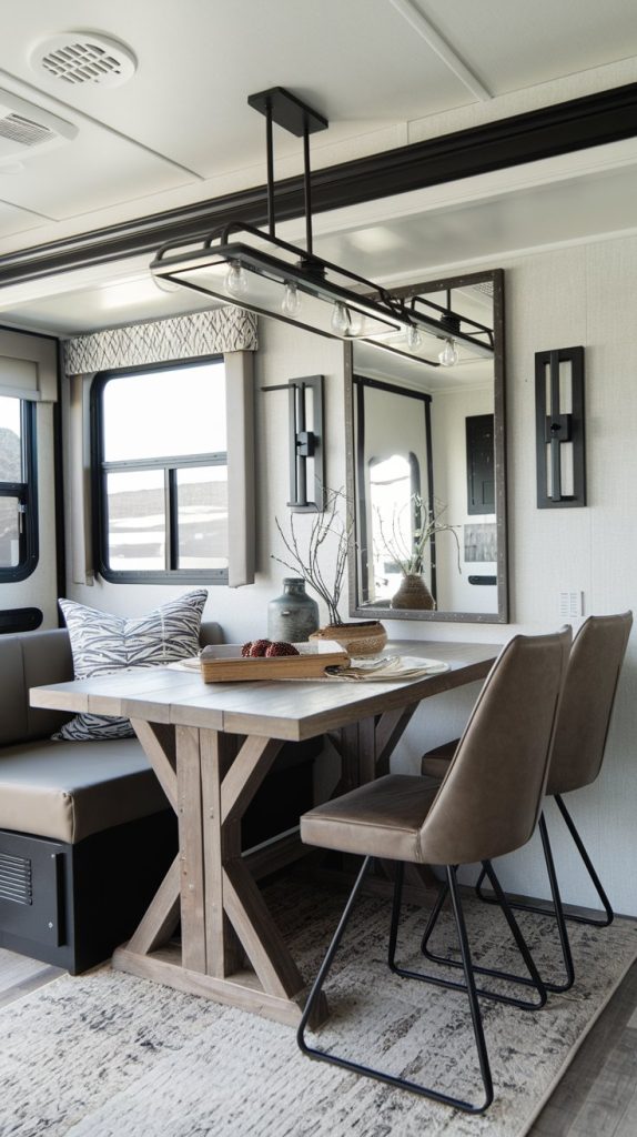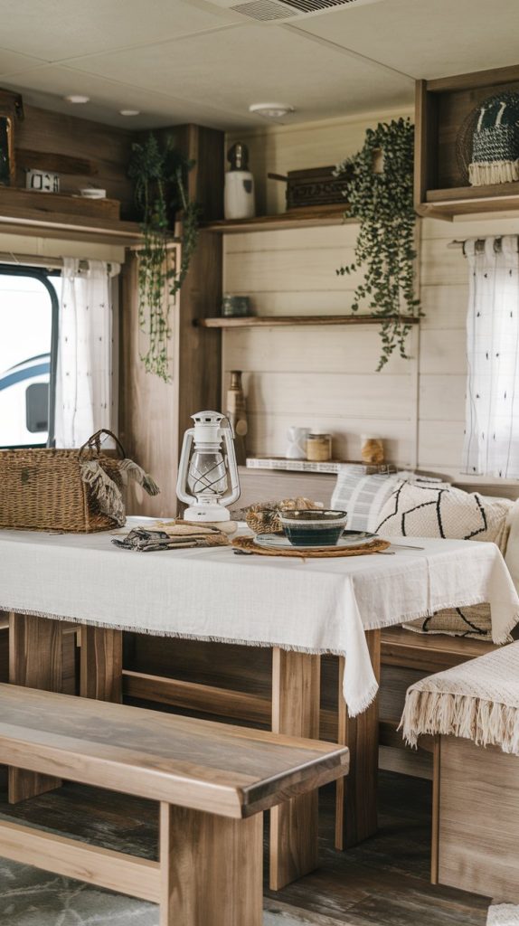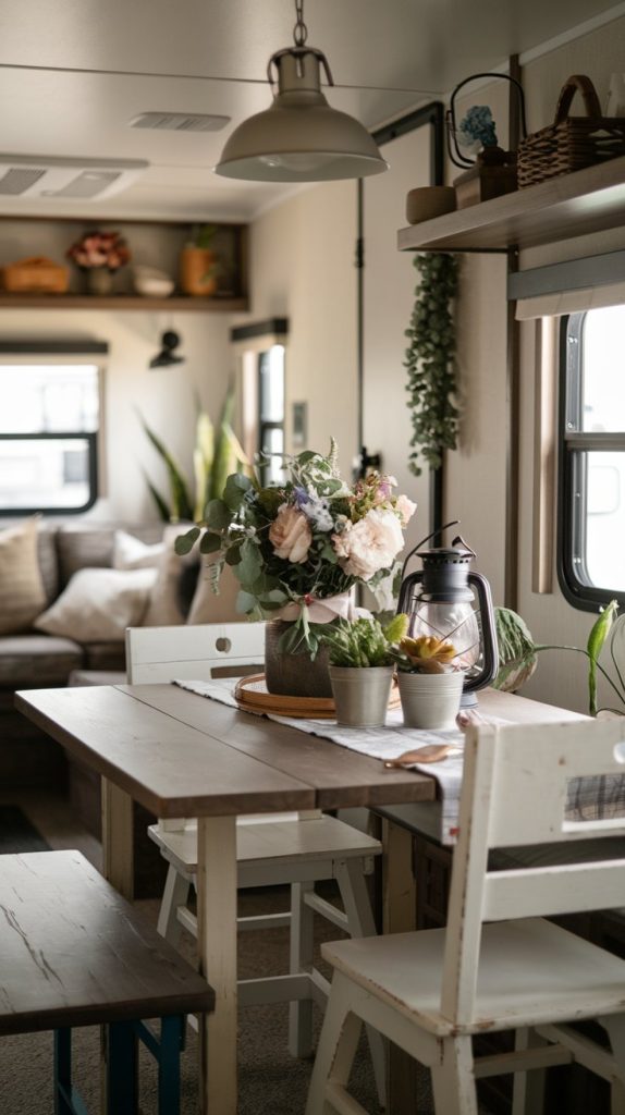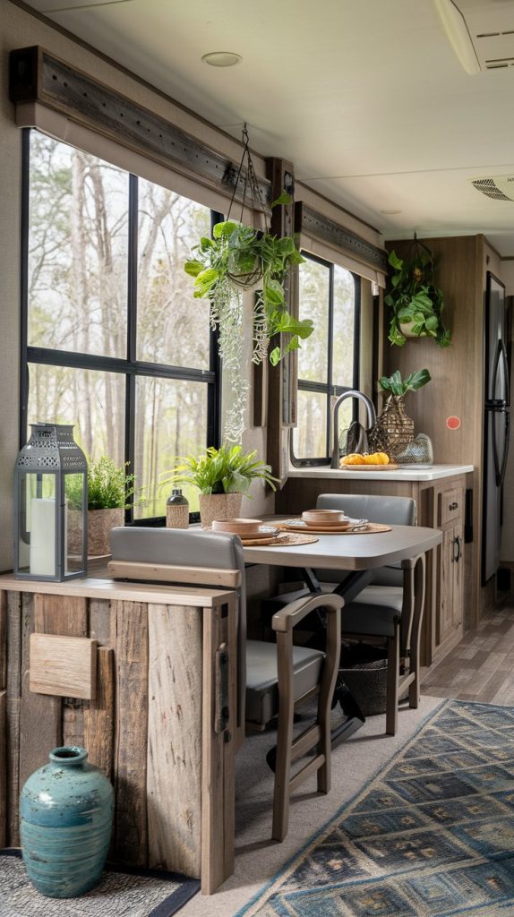 This dining area has a charming farmhouse style with a wooden table, mismatched chairs, and rustic decor. The space feels cozy and inviting, perfect for enjoying home-cooked meals on the road.