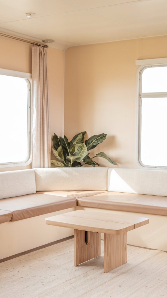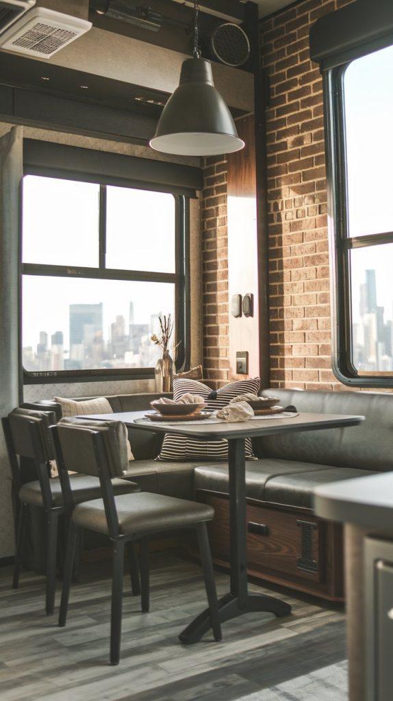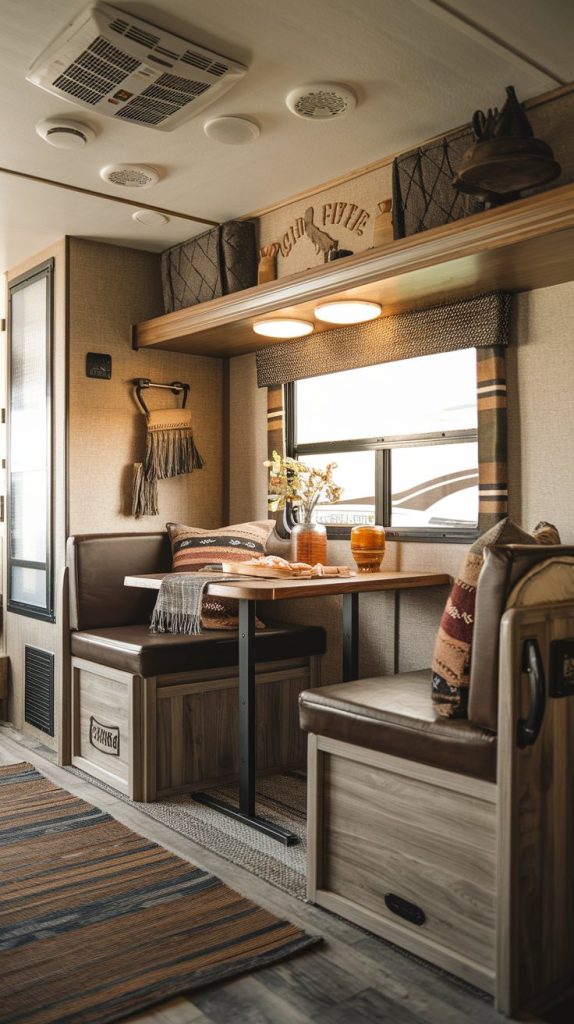 This image showcases a small, cozy dining nook tucked into a corner of an RV. The space features a built-in bench with plush cushions and a compact table, perfect for intimate meals. Soft lighting and decorative elements like throw pillows and a small plant add to the warmth and charm of this inviting spot.