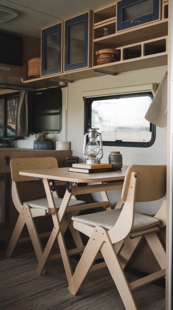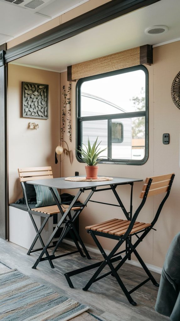 A tiny dining area designed for ultra-small spaces, featuring a compact table and foldable chairs. The space is functional and efficient, perfect for maximizing limited RV interiors.
