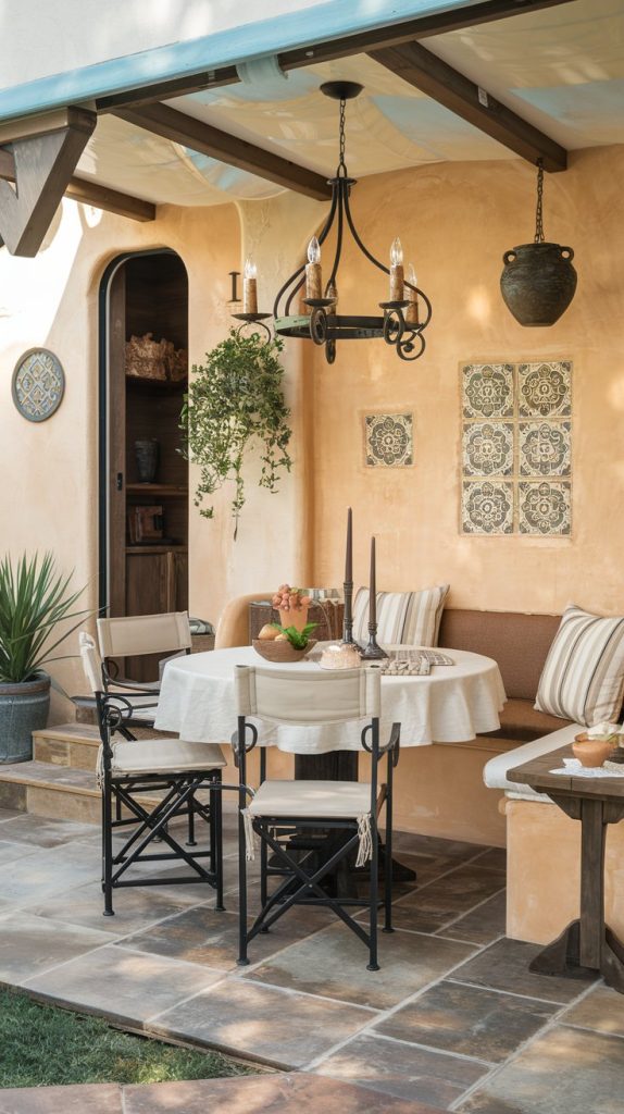 This dining area has a Mediterranean-inspired design with warm colors, rustic furniture, and decorative tiles. The space feels cozy and inviting, perfect for enjoying meals with a touch of Mediterranean charm.