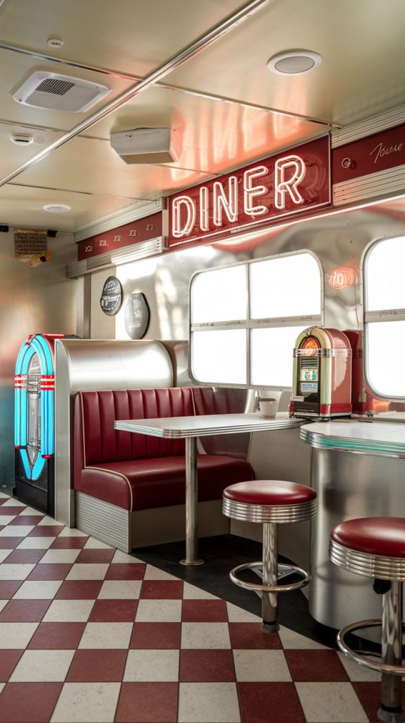 A retro diner-style dining area with a classic booth, checkered floor, and nostalgic decor. The space feels fun and lively, perfect for enjoying casual meals and snacks.