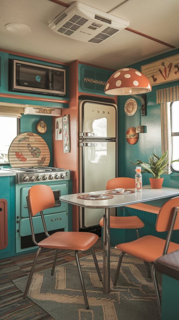 This image showcases a vintage-inspired dining area with retro furniture and decor. The space features a classic table and chairs, nostalgic accessories, and a fun, playful atmosphere.