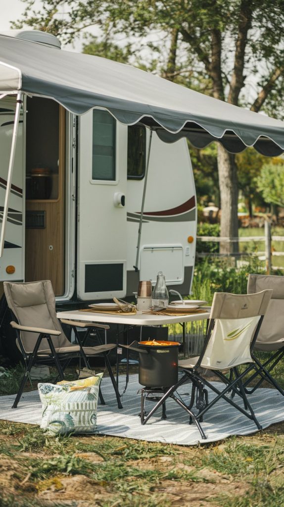 An outdoor dining area with a portable table and chairs, perfect for enjoying meals alfresco. The space features a canopy for shade and comfortable seating, creating a pleasant outdoor dining experience.