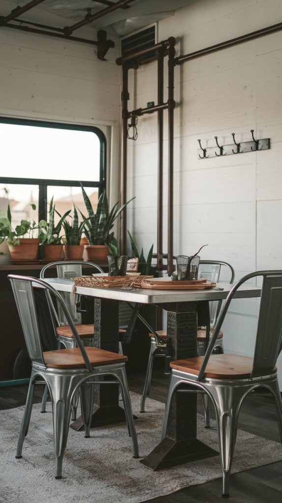 This image highlights an industrial-style dining area with metal and wood elements. The space features a sturdy table, metal chairs, and exposed pipes, giving it a modern, edgy look.