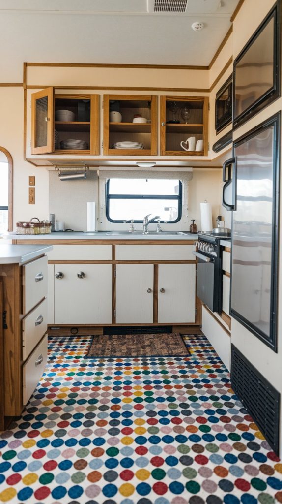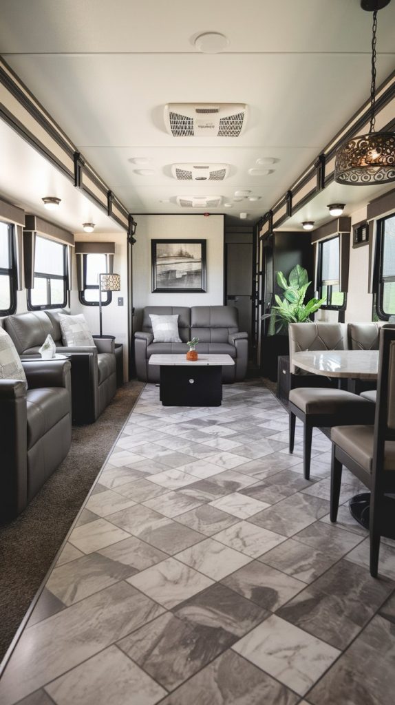 Terrazzo flooring is a stylish and durable option that can add a unique touch to your RV interior. It is made from a mix of marble, quartz, granite, and glass chips, creating a distinctive, speckled look. Terrazzo is also highly durable and easy to maintain.