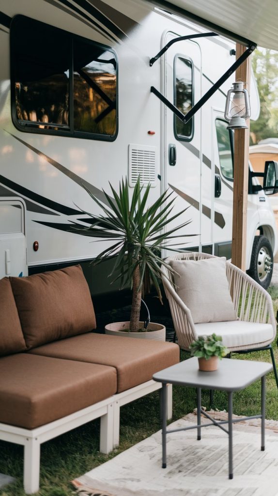 Creating a lounge space outside your RV can make your camping experience feel more like home. Set up some comfy chairs and a small table, and don’t forget a few plants or flowers for a touch of nature. It’s the perfect spot to relax with a book or share stories with friends around a campfire.