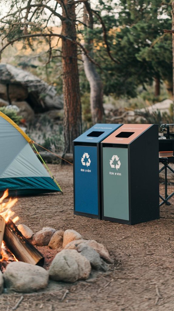 Managing waste while camping is essential for protecting nature. The image shows two bins designed for recycling, making it easy to sort waste properly. Using these bins helps keep campsites clean and reduces landfill contributions.