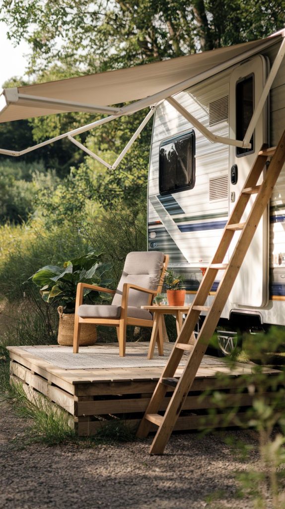 Imagine stepping outside your RV into a cozy reading nook. This space is designed for relaxation, surrounded by nature’s beauty. Sunlight filters through leafy branches, creating a warm and inviting atmosphere.