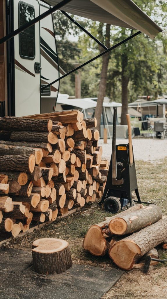 Keeping your camping area tidy is key, and a stylish firewood storage can make a difference. The image shows a neat wooden box filled with firewood, positioned next to an RV. This setup not only looks good but also serves a practical purpose.