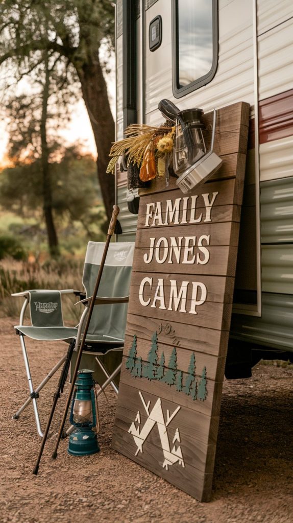 Personalized signage can make your RV camping space feel like home. A custom sign reflects your family’s unique personality and adds a welcoming touch to your outdoor area. The image shows a charming sign displaying ‘FAMILY CLAUN CAMP,’ which captures the essence of togetherness and fun.
