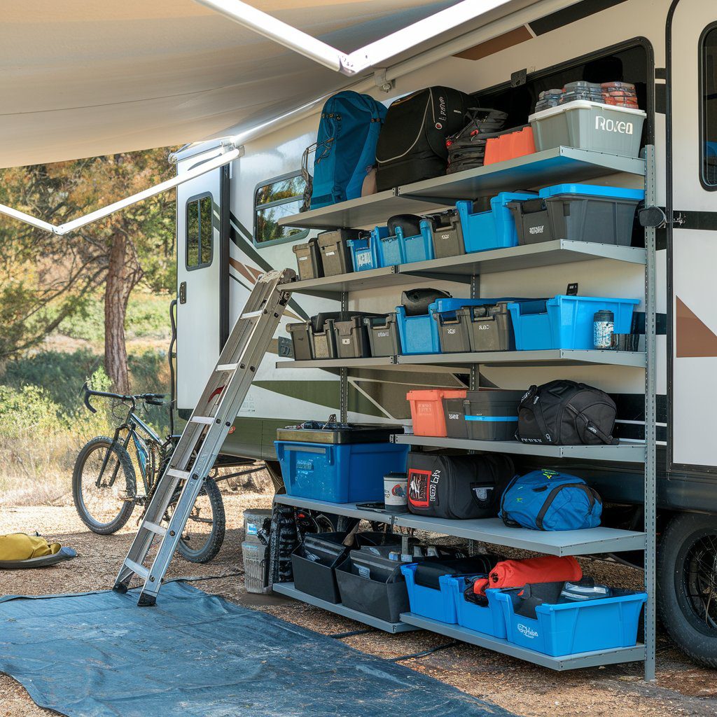 Keeping your RV organized can make a huge difference in your camping experience. The image shows a well-arranged storage area that maximizes space and efficiency. With shelves loaded with various bins, bags, and gear, it’s clear that thoughtful organization pays off.