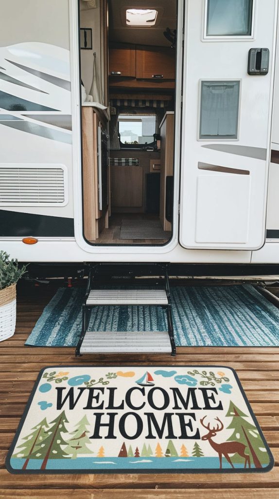 Your RV’s entryway is the first thing guests see, so why not make it inviting? A welcoming entryway mat can set the tone for your entire camping experience. The mat in the image features a cheerful design, complete with trees, a sailboat, and a deer. It says ‘WELCOME HOME’ in bold letters, instantly giving off a friendly vibe.