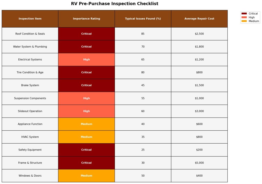 The National RV Inspectors Association reports that a typical inspection costs $500-800 but can save you thousands in repairs. Common issues found include: