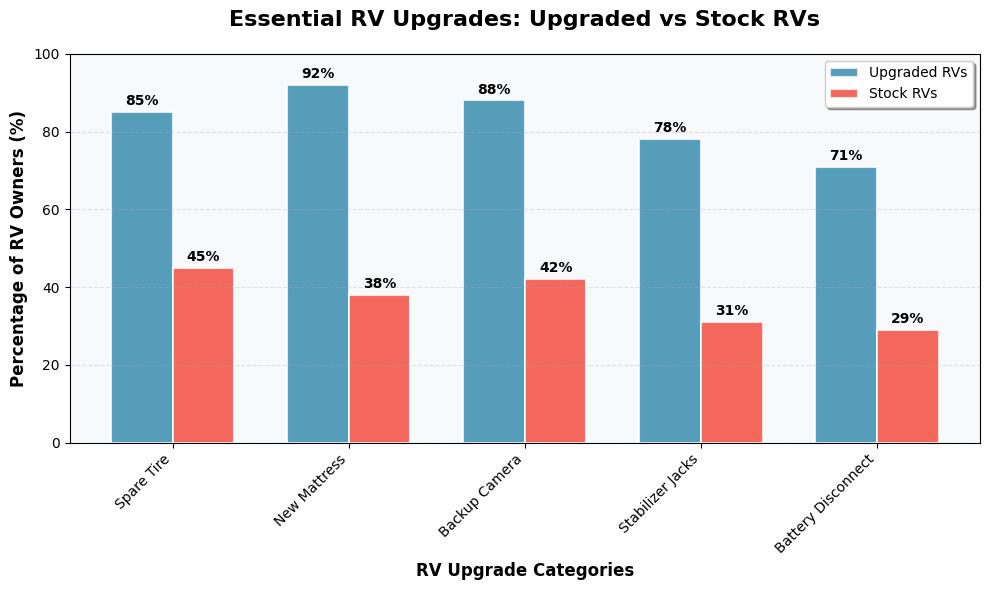 This comparison chart reveals the stark difference between RV owners who’ve done these essential upgrades versus those still suffering with factory equipment. The data shows that upgraded RVs consistently outperform stock units across all categories, with improvement rates ranging from 40-54 percentage points.