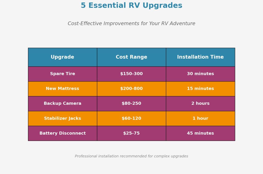 The total investment for all five upgrades ranges from $515 to $1,545, with an average installation time of just 4.5 hours. Compare that to the cost of one major RV repair or the price of cutting a vacation short, and these upgrades pay for themselves on the first trip.