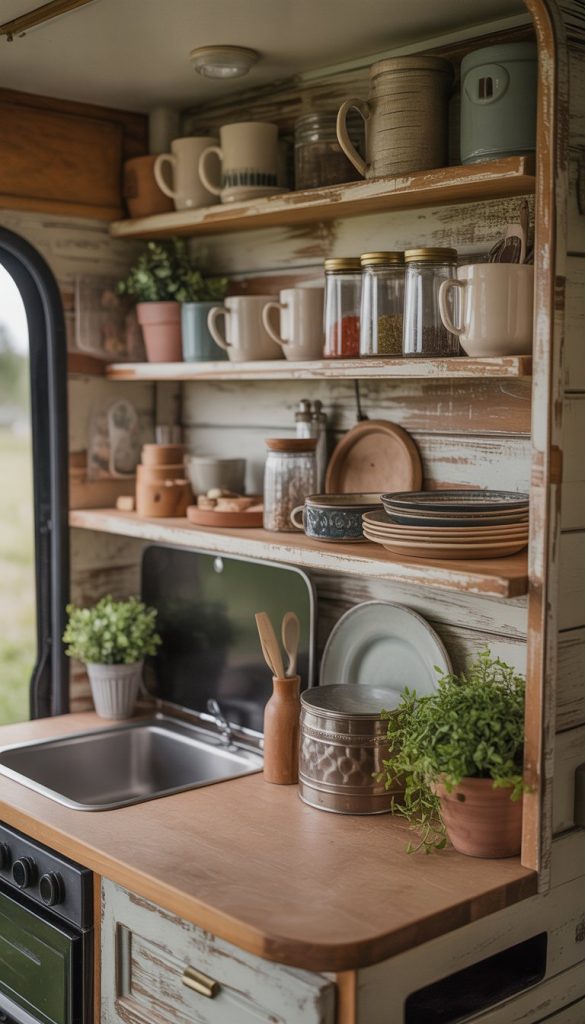 Using distressed wood for open shelving gives your camper kitchen a cozy and lived-in feel. The rough texture and worn look fit perfectly with the shabby chic style. It adds character without feeling too new or shiny.