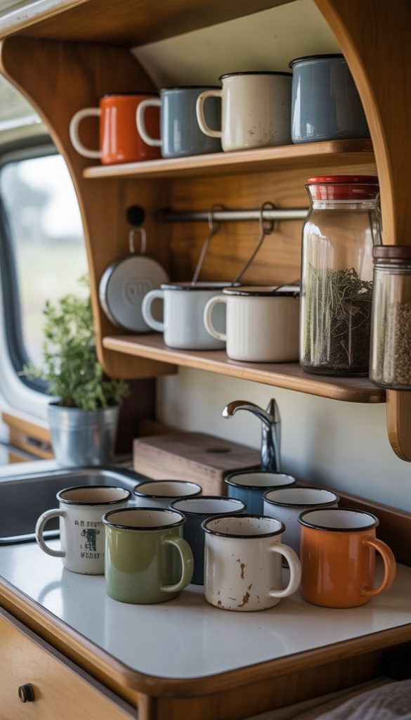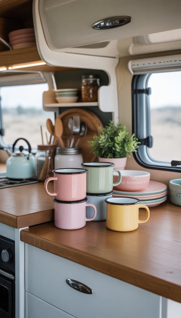 Adding pastel-colored enamel mugs to your camper kitchenette brings charm and color. These mugs fit well with shabby chic style because they look simple but pretty.