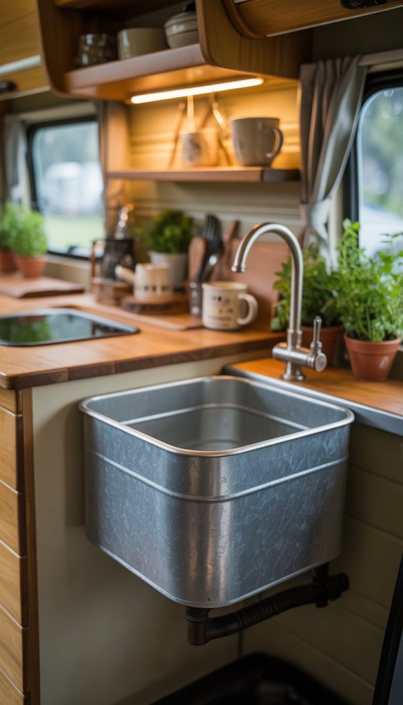 A small galvanized metal sink fits perfectly with shabby chic style. It adds a rustic charm and feels cozy in your camper kitchenette.