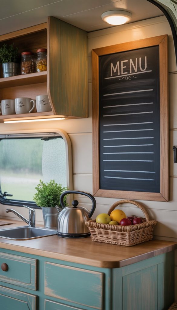 A chalkboard menu adds charm and function to your camper kitchenette. It lets you list meals, snacks, or even daily specials. This adds a personal touch that fits the shabby chic style well.