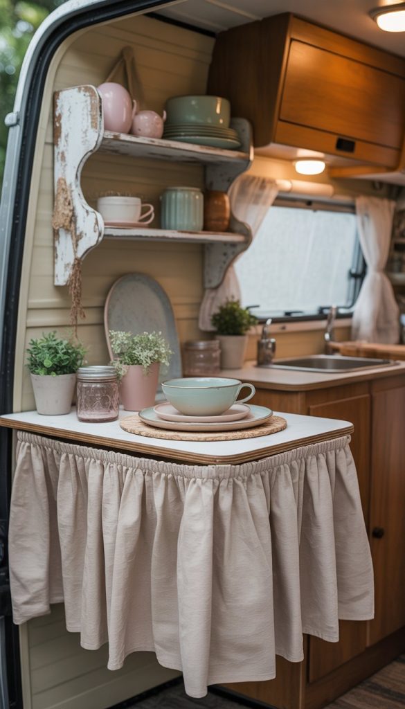 A ruffled fabric table skirt can bring charm to your camper kitchenette. It hides storage under the table while making the space feel cozy.