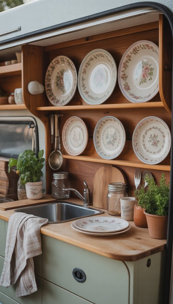 Adding shabby chic patterned plates can bring charm and personality to your camper kitchenette. Look for plates with floral designs, soft colors, or vintage prints. These patterns add a cozy and homely feel to your space.