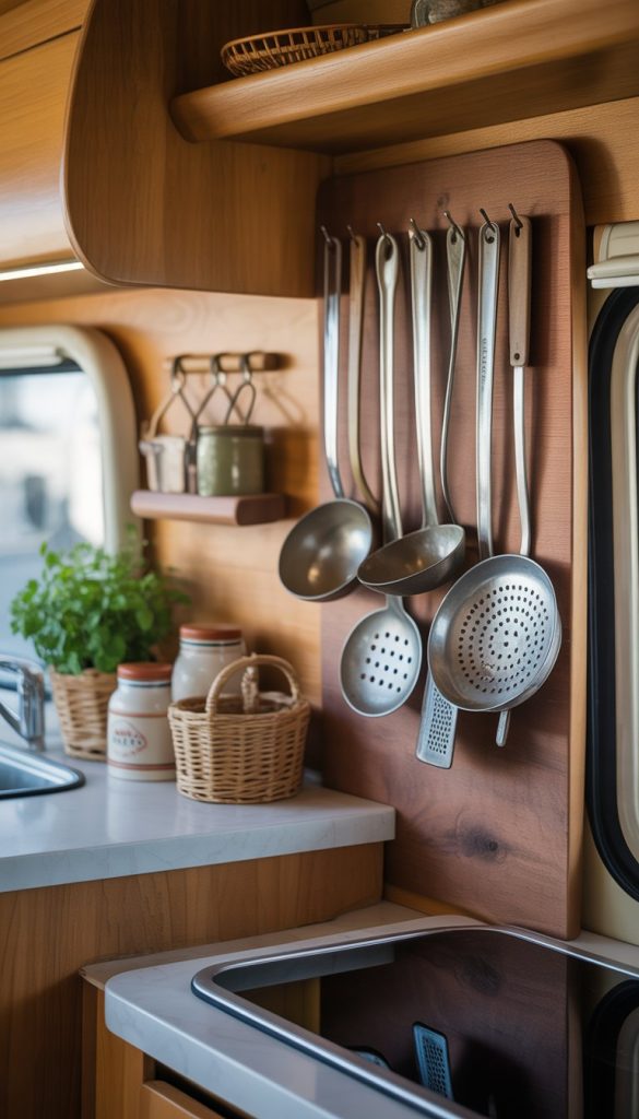 Hanging old cooking tools adds charm to your shabby chic camper kitchen. You can use vintage spoons, whisks, or ladles to bring a rustic feel. These simple pieces tell a story and make your space cozy.